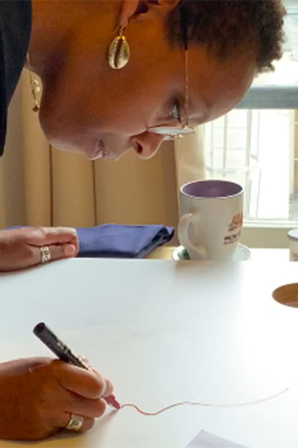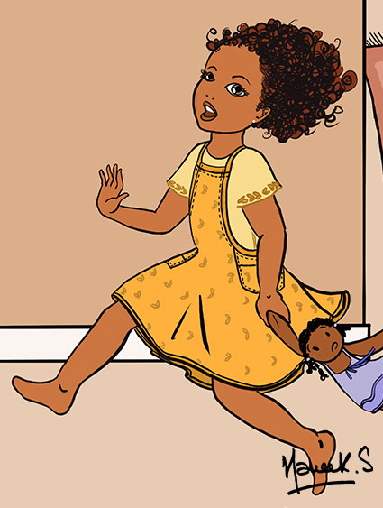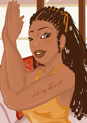 Mes dessins racontent la femme dans son quotidien. Ayant grandi dans un univers masculin, c'est à l'adolescence que je réalise la complexité de s'affirmer en tant que femme, puis en tant que femme noire. Je comprends, alors, la puissance de l'identification et cela m'éveillera sur le manque de modèle dans mon univers culturel.